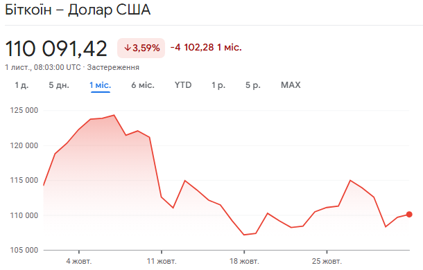 Bitcoin ended October 2025 with a drop of almost 4%, breaking a six-year streak of growth this month. The largest cryptocurrency started the month at $114,079 and ended at about $110,000, according to trading data.