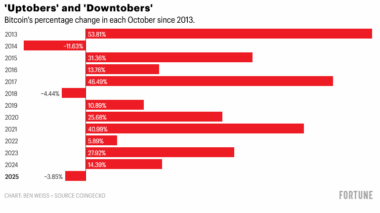 The last "red" autumn for bitcoin was in 2018, when it fell by 4% in October to $6303, and the following month it collapsed by another 36.4%, according to TradingView .